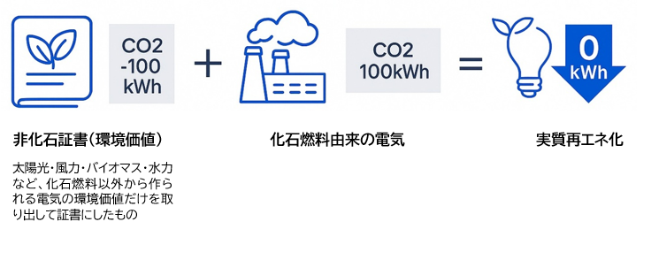 「非化石証書」とは、太陽光や風力などの再生可能エネルギーや原子力など、CO2を排出しない「非化石電源」で発電された電気が持つ“環境価値”を証書として切り出し、売買できる制度です。通常、電気そのものには「どの発電方法で作られたか」の区別がありませんが、非化石証書を活用することで「この電気はCO2を排出しない方法で作られた」と証明することが可能です。